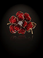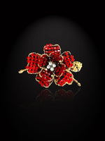 Our Classic Peony Brooch is a beautiful, bright red with gold leaf. This can serve as a beautiful pop of color to almost any look from work to an evening out. Works beautifully with a myriad of colors. It is handcrafted with crystals with a vintage rhinestone center. Always the perfect addition to blazers, sheaths, or wrapped onto existing pearls.