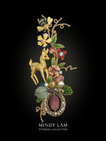 The fawn followed a sparkly path, filled with pearls, natural pink tourmaline, sapphire, aquamarine, blue apatite stones. The vintage bumble bee hovers above, collecting pollen from the enameled wildflower as the perfect disguise. The brooch is engulfed and finished with 14kt gold-filled vines.