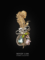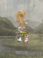 The golden rhinestone encrusted feather is a vintage by Ciner, the creatures of the magical forest embellished the grand eagle's feather with a silver-jeweled bowtie, vintage enameled roses, citrine and a 38ct aquamarine stone. Maybe a bit of magic.