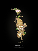 The gold and vintage frog of the story is a vintage by Ciner. The frog holds a vintage rose and blossom by their stems. The brooch is engulfed in 14kt gold-filled vines and is anchored on a champagne crystal drop. It is embellished with natural citrine,