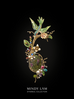 The vintage hummingbird's first journey took her to a ganden filled with ruby fuchsite, turquoise, peridots and  aquamarine. The brooch is engulfed 14kt gold-filled vines.