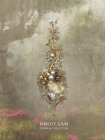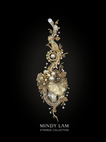 The Grand Phoenix is a rhinestone encrusted gold vintage with a pearl center. A rhinestone branch stretches over the Queen, with pearly buds growing. The throne that is manifested has a vintage Miriam Haskell element, champagne crystal blossoms on top of a vintage tropical leaf and  pearly leaves. Adorned with floating pearls and rhinestone. The lapel pin is rooted in a clear crystal drop framed by a ring of pearls and rhinestones, representing the purity of the Queen's heart. All finished with 14kt gold-filled wires.