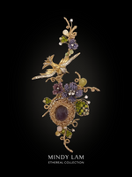 The centerpiece of the lapel pin is our golden baby swallow, its wings and tail encrusted in rhinestones. It's flying through the field of plum crystal wild flowers, rooted in a stunning vintage purple jeweled Ciner element. The lapel pin is embellished with natural citrine, green garnet and pink quartz stones.