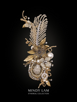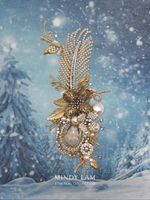 The vintage pearly feather is rooted in a crystal drop framed by a ring of pearls and rhinestones. It is loved and surrounded by cluster of pearls and pearl blossoms, with floating rhinestones to mimic the snowfall. The scene is also accented with vintage floral elements like the centerpiece - vintage dogwood. The brooch is finished with 14kt gold-filled wire.