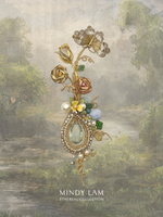 Hovering above the flowers is a vintage butterfly. The brooch is composed with vintage roses and enameled gardenias. The flowers are accented by sapphire, blue apatite, green garnet, aquamarine, golden rutilated quartz , blue lace agate and pearls. The brooch is anchored by a breathtaking 28ct green amethyst framed and engulfed in 14kt gold-filled vines, pearls and rhinestones that represents the great green lake. All finished with 14kt gold-filled wires.