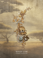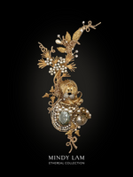The gold tree with pearl blossoms is providing shade for our young lion. He sits by vintage gold foliages, wild flowers and a cluster of pearls. The brooch is rooted in a stunning 29ct green amethyst framed by pearls, rhinestones and gold vines. All finished with 14kt gold-filled wires.