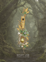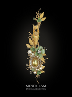 The stallion is a jeweled vintage piece by Ciner, adorned with a beautiful black crown. The forest is filled with Mindy Lam Classic mint crystal blossoms, vintage gold leaflets, and gold vines. The lapel pin is embellished with pearls, floating rhinestones, natural green garnet, emerald stones, and a stunning 29ct yellow topaz framed by rings of pearls, rhinestones, and gold vines. The brooch is finished with 14kt gold-filled wires.