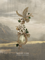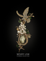 The grand eagle is encrusted in rhinestones, with his talons approaching a cluster of white wild flowers. The divine flowers are engulfed in 14kt gold-filled vines and accented with a cluster of pearls, natural citrine, emerald , green tourmaline, golden rutilated quartz stones. The brooch is finished with 14kt gold-filled wire and a large crystal drop with a frame filled with pearl.