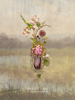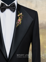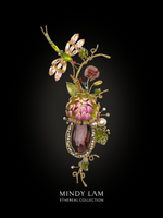 The centerpiece of the Glowing from Grace is an enameled pink and bright yellow chrysanthemum. Accompanied by vintage wild flowers, pearls, and crystal leaves. Flying above to admire the reserve's beauty is a rhinestone encrusted dragonfly. The lapel pin is anchored by a crystal drop with a rhinestone frame and accented by aquamarine, green garnet and rose quartz. All finished by 14kt gold-filled wires.