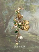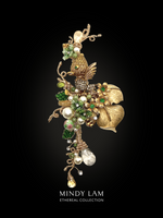 When you hear the drumming ring throughout the forest, you can find our charming vintage woodpecker with a rhinestone belly. She sets her stage up next to mint cluster blossoms, a cluster of pearls, natural citrine, green garnet, and peridot stones. The brooch is detailed with crystal drops, vintage rhinestones and a large vintage leaflet. The brooch is finished with 14kt gold-filled wire.