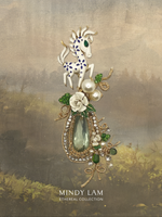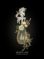 The horselike creature is a Crown Trifari vintage from 1967, it dances on top a cluster of pearls and vintage enameled white rose. The brooch is anchored by a breathtakingly stunning 39ct green amethyst set in Mindy Lam's Signature Metal Lace, accented by rhinestones, pearls, natural green tourmaline and green garnet. The brooch is engulfed and finished with 14kt gold-filled vines.