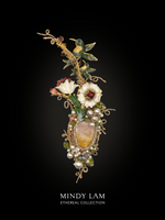 The pair of enameled hummingbird is hovering above a pair of sweet berry red centered white vintage flowers, they look magical. The flowers are rooted in a natural agate stone framed and engulfed in pearls and gold vines. Paired with the flowers is a vintage Miriam Haskell pearl flowers cluster. Accented with green garnet, peridot, vintage wild flowers, leaflets and Mindy Lam Classic crystal blossoms. The brooch is finished with 14kt gold-filled wires.