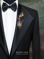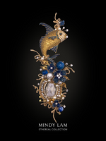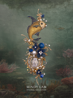 The Prince of the Deep Blue is a vintage sea creature with gold scales and indigo fins. His face is detailed with jewels. He hovers above a reef filled with vintage floral elements, crystal flowers, pearls and natural blue appetite stones. The lapel pin is rooted in a crystal drop framed by a ring of rhinestone and pearl. All finished with 14kt gold-filled wires.