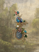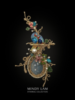 The sparkling lovebirds are sitting on a golden branch. They are surrounded by vintage enameled flowers, pearls and natural stones including ruby, turquoise, green garnet and a stunning 49ct aquamarine. The brooch is engulfed 14kt gold-filled vines.