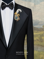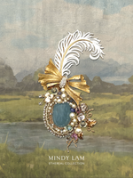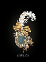 The owl's feather is a vintage by Crown Trifari. It is held together by a vintage gold bow and embellished with Mindy Lam's signature 14kt gold-filled hand folded leaflets, pearls and vintage enameled wildflowers. The centerpiece is a breathtakingly stunning 89ct milk aquamarine set in Mindy Lam's Signature Metal Lace... Accompanied by natural sapphire stones and maybe a bit of magic.