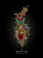 Our vintage lily in the valley is rooted in a stunning crimson red crystal drop framed by rings of rhinestones and pearls. A vintage magenta butterfly is fluttering by the vintage floral elements, foliage, crystal leaves. The lapel pin is accented by floating rhinestones, natural blue appetite and green garnet stones. All finished with 14kt gold-filled wires.