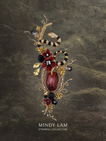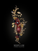 Our black, gold and jeweled serpent is a stunning vintage with beautiful red eyes. He is surrounded with Mindy Lam Classic crimson red crystal blossoms, vintage floral elements. Accented with crystal leaves, crystal drop, floating rhinestones, natural black turmaline, tiger eye and onyx stones. The lapel pin is rooted in a crimson red crystal drop framed by a ring of rhinestones and pearls. All finished with 14kt gold-filled wires.