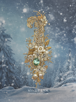 The feather is rooted in a natural 29ct aquamarine stone framed by a ring of pearls and rhinestones. It is loved and surrounded by cluster of pearls and pearl blossoms, with floating rhinestones to mimic the snowfall. The scene is also accented with vintage floral elements. The brooch is finished with 14kt gold-filled wire.