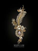 The vintage pearl feather is rooted in a natural amethyst framed by a ring of pearls and rhinestones. A vintage butterfly is drawn to the feather, hovers by a cluster of pearls and pearl blossoms. The brooch is finished with 14kt gold-filled wire.