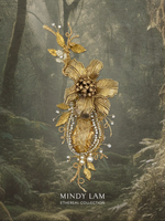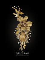 The Golden Lily is jeweled centered vintage by Ciner accompanied by vintage gold leaves and a pearl blossom. The lily is engulfed in 14kt gold-filled vines, accented with pearls and floating rhinestones to mimic the glow on the sun-kissed petals. A stunning champagne crystal drop engulfed in rhinestone, gold pearls and gold vines. The brooch is finished with 14kt gold-filled wire.