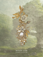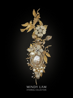Our vintage swallow hovers above a jeweled blossom, embraced by gold vines and loved by Mindy Lam Classic pearl blossoms and vintage gold foliage. The lapel pin is embellished with pearls, floating rhinestones, and paired with a stunning phantom quartz framed by rings of rhinestones and pearls. All finished with 14kt gold-filled wires.