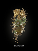 The stallion is a vintage by Ciner, it is paired with a stunning jasper stone. The lapel is filled with an abundance of mint crystal blossoms, pearls and detailed with green peridots. All finished with 14kt gold-filled wires.
