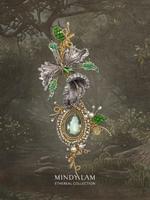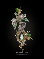 Our vintage wild orchid is rooted in a green amethyst framed by a ring of pearls and rhinestones. It is accented with crystal leaflets, pearls, floating rhinestones and a natural gold rutilated quartz. The brooch is finished with 14kt gold-filled wires and natural citrine stones.