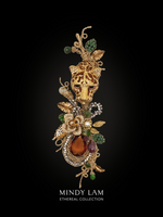 The fierce panther is a vintage piece by Ciner, with striking jet-black eyes. The big cat admires his gift from the jungle—a rhinestone encrusted golden rose, also a vintage by Ciner. The pair is surrounded by foliage in gold and forest green crystal including hand forged 14kt gold-filled leaves and a vintage from Boucher. Accented with natural citrine, emerald, green garnet, golden rutilated quartz and pink tourmaline stones. All this beauty is stemmed and highlighted by the 77ct topaz stone, engulfed in gold vines and framed with rhinestones and pearls. The topaz stone mimics the warmth cast by the sun. The lapel pin is finished with 14kt gold-filled wires.