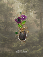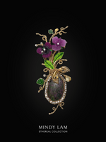 Our vintage and delicate wild orchids are rooted in a rhinestone engulfed ruby fuchsite stone. It is accented with leaflets by Ciner, crystal leaves by Mindy Lam. The brooch is finished with 14kt gold-filled wires and natural citrine stones.