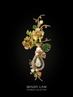 The vintage twin roses are anchored by a 28ct green amethyst. Accompanied by a vintage Ciner leaflet. The brooch is engulfed in 14kt gold-filled vines and rhinestone. It is embellished with pearls and natural citrine stones..