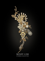The Prince of Peacocks makes a grand entrance every morning, with the perfect sunlight as backdrop. The Prince walks with elegance, showing off his rhinestone engulfed train that spreads out like a throne. The pearly wild flower blossoms for his arrival, each step with more lush blooms to appreciate. The brooch is embellished with pearls, vintage flowers, crystal drops and natural golden rutilated quartz. All finished in 14 kt gold-filled wires and engulfed rhinestone vines.