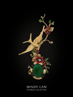 The golden swallow, leaflet are vintage by Ciner. The brooch is engulfed 14kt gold-filled vines. It is embellished with natural green tourmaline and emerald stones.