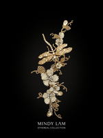 The golden boy in the story is a vintage by Ciner, the full lapel brooch is made out of Mindy Lam classic pearl blossoms, and the piece is finished by 14kt gold-filled wire.