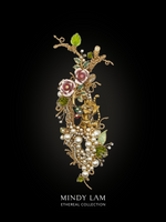 The vintage tiger is a vintage by Jomaz. Above our tiger is a pair of vintage rose blossom, foliage rooted in gold vines and rhinestones and accented with natural golden rutilated quartz. The ground is rich in pearls, craving up the perfect path of our tiger's garden. All finished with 14kt gold-filled wires.