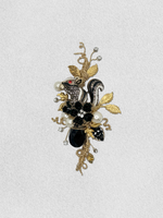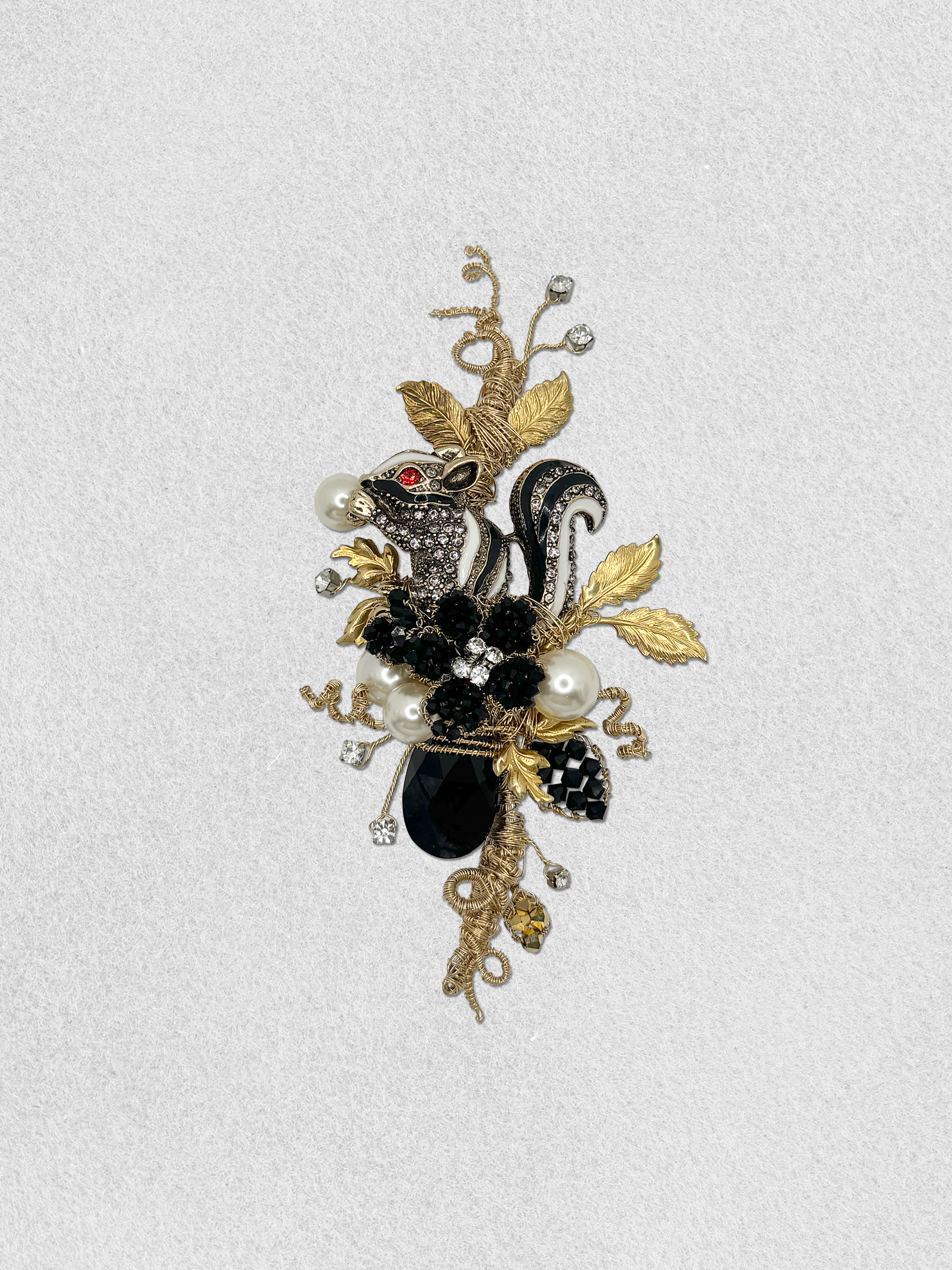 A jeweled squirrel is snacking on a pearly acorn it found. The scene is filled with floating rhinestones, crystal flowers, crystal leaves, vintage foliage, pearls and a black crystal drop.