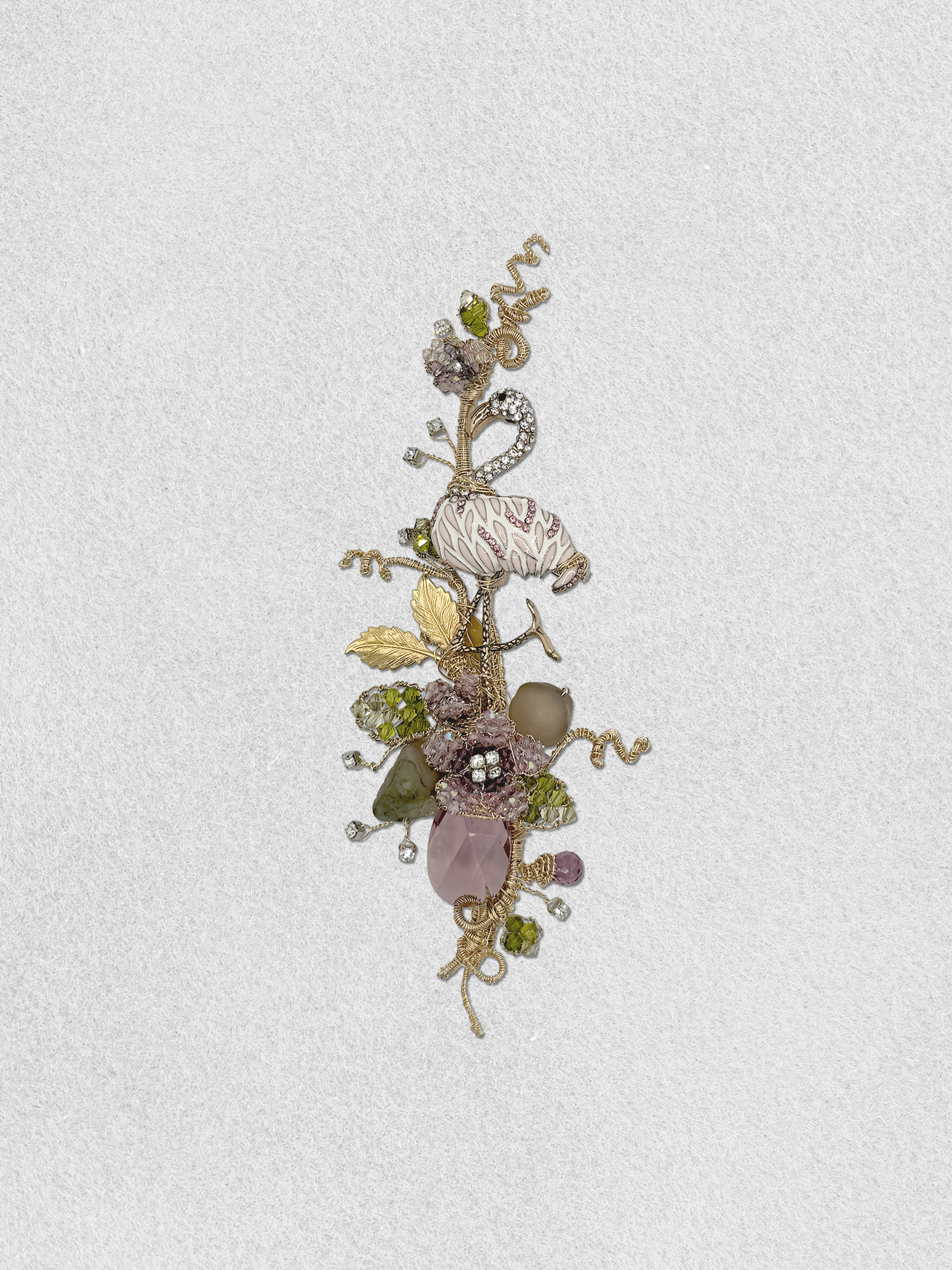 A sweet flamingo is hanging out in the crystal garden. The scene is filled with floating rhinestones, crystal leaves, vintage foliage, a natural amethyst stone and a plum crystal drop.