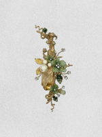 The Charm of the Poodle lapel pin. This charming vintage gold poodle sits by mint crystal blossoms. The lapel pin is accented with pearls, vintage foliage, floating rhinestones, natural green garnet stones and rooted in a champagne crystal drop. All finished with 14k gold-filled wire.