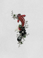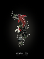 The Crimson Splash lapel pin. In this scene, a crimson red koi swims amongst black crystal blooms. Accented by crystal leaves, floating rhinestones and anchored by a black crystal drop.
