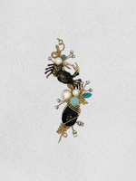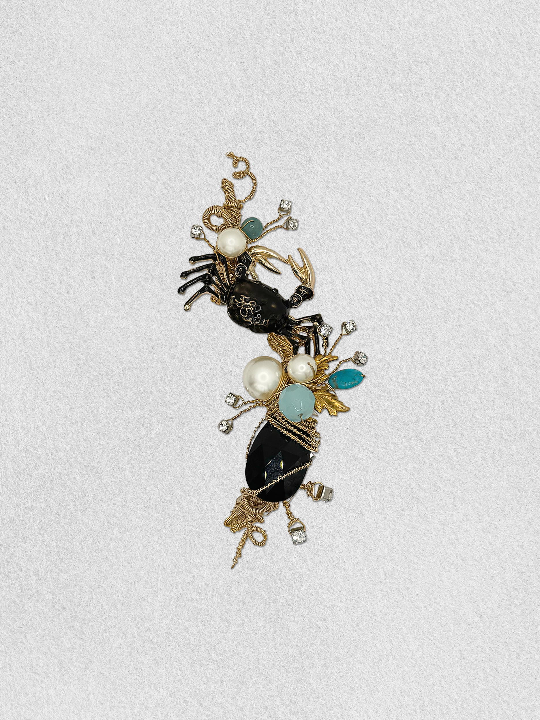 The Dancing Crustacean lapel pin. A black and gold crab is having the time of its life. Dancing next to a cluster of pearls, aquamarine and turquoise stones. The scene is anchored by a black crystal drop engulfed in gold vines. All finished with 14k gold-filled wire.