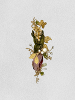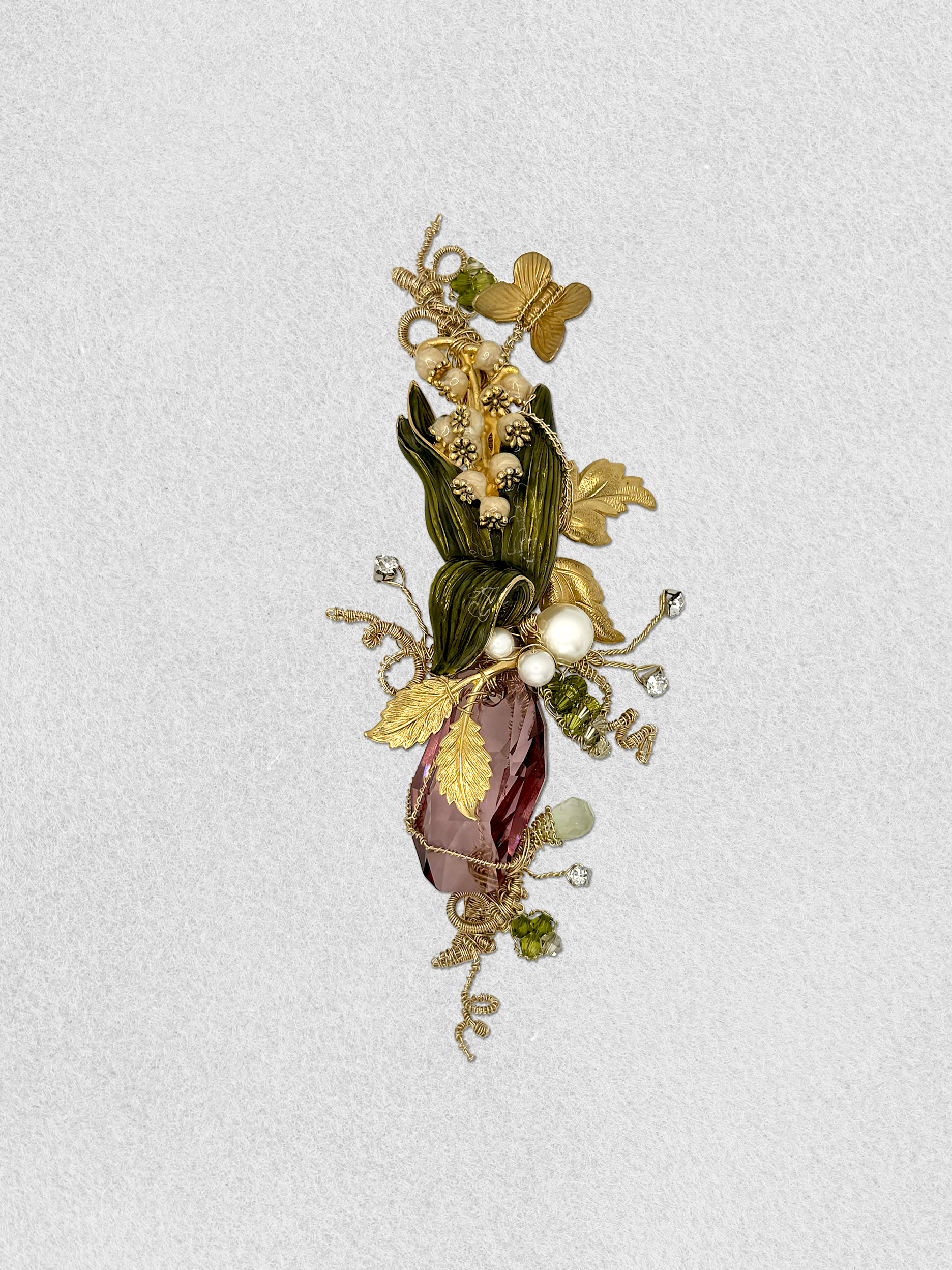 The Dreaming of Lily of the Valley lapel pin. The magical scene is a sweet and delicate Lily of the Valley ringing its bells. Rooted in a blush crystal drop, accented by pearls, vintage foliage, crystal leaves, floating rhinestones, a natural green garnet stone and a gold butterfly. All finished with 14k gold-filled wire.
