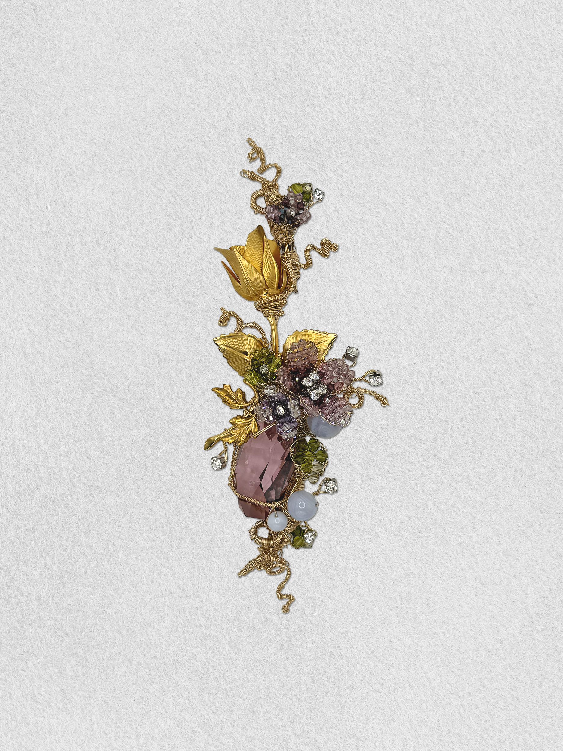 The Garden Rose of Grace lapel pin. A vintage gold rose thriving by a cluster of crystal blossoms. The scene is filled with crystal leaves, vintage foliage, floating rhinestones, natural blue lace agates and anchored by a blush crystal drop. All finished with 14k gold-filled wire.