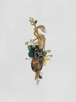 The Grace of the Phoenix lapel pin. In this scene a peacock sit atop a tree by a cluster indigo crystal blossoms... admiring the paradise from above. Accented by crystal leaves, vintage foliage, floating rhinestones, natural blue apatite stones and set on a jasper stone. All finished with 14k gold-filled wire.