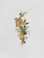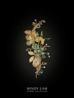 The Humming in Bliss lapel pin. The scene is a vintage hummingbird collecting sweet nectar by a giant vintage gold leaf. The lapel pin is accented with mint crystal blossoms, crystal leaves, vintage foliage, floating rhinestones and anchored by a champagne crystal drop. All finished with 14kt gold-filled wires.