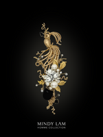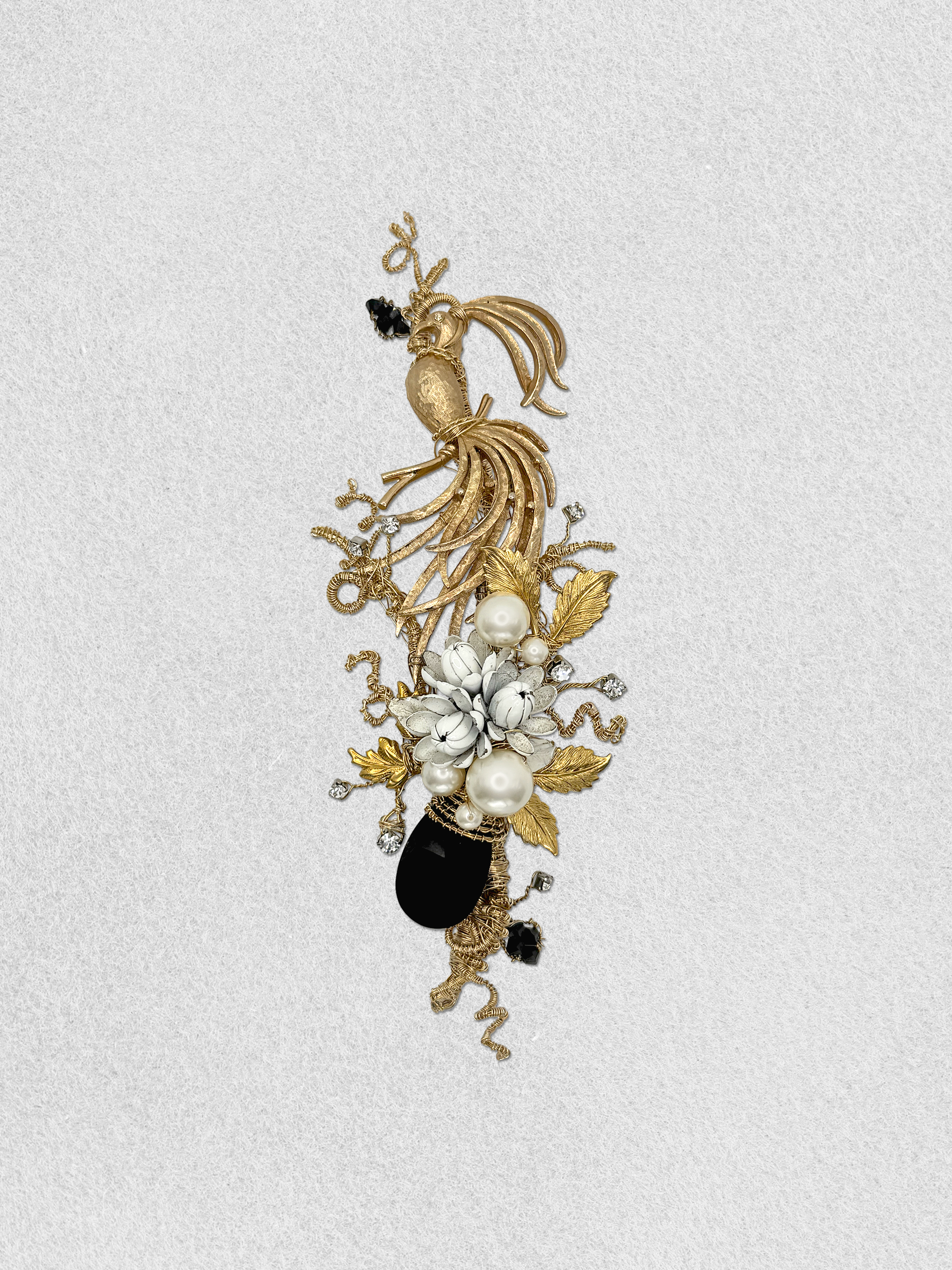 The Magnolia and Phoenix lapel pin. Perched on a vintage magnolia tree with a view of the magical forest with all of its glory on display, the phoenix rests amongst a cluster blossoms and pearls. The scene is filled with vintage foliage, crystal leaves, pearls, floating rhinestones and anchored by a black crystal drop. All finished with 14k gold-filled wire.