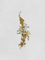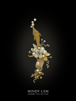 The Mystical Leap lapel pin. In this scene we follow the journey of a vintage gold mystical fish as leaps out of the water. He swims with rhythm between pearl blossoms. The scene is filled with vintage foliage, pearls, floating rhinestones and anchored by a champagne crystal drop. All finished with 14kt gold-filled wire.
