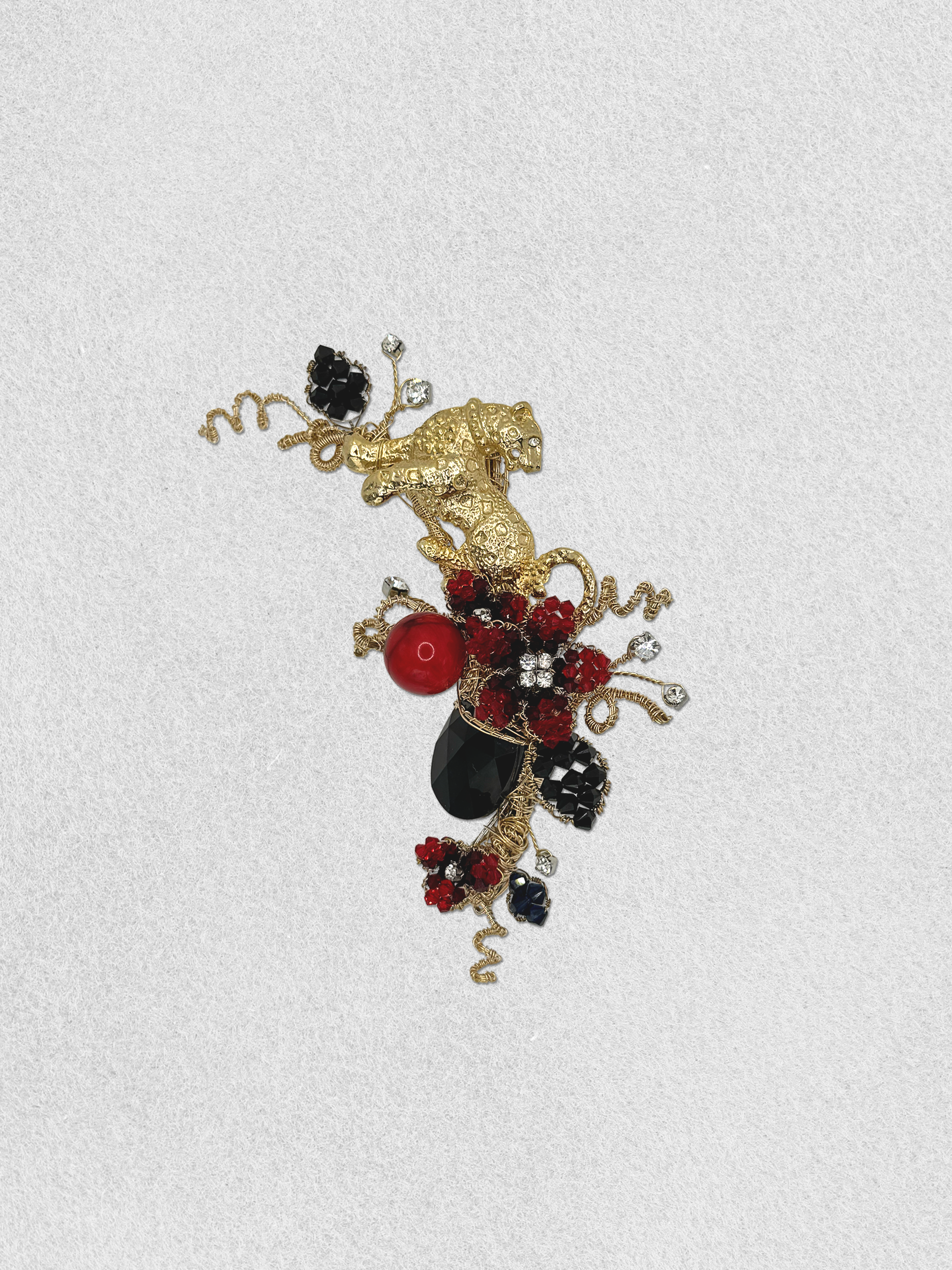 The Roaring Rosettes lapel pin. The scene is a vintage jeweled clouded leopard sitting by a cluster of crimson red crystal flowers. Accented with crystal leaves, coral, floating rhinestones and anchored by a black crystal drops. All finished with 14kt gold-filled wire.
