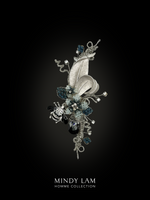 The Silver Foliage and Bumble lapel pin. In this scene, a pair of giant silver vintage leaves dances with denim blue crystal blossoms, they move elegantly with the wind. A jeweled bumble hovers by. Accompanied by crystal leaves, floating rhinestones and anchored by a black crystal drop.