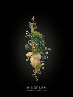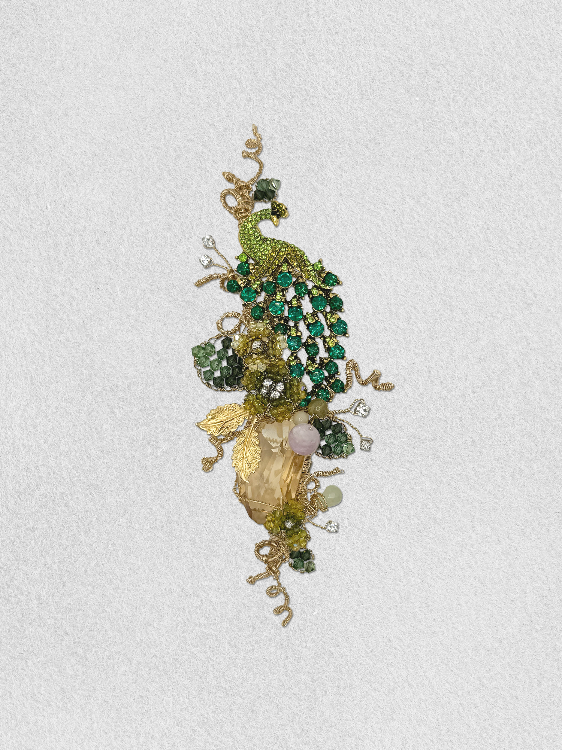 The Train of Elegance lapel pin. In this scene a jeweled peacock sit atop a tree by a cluster olive green crystal blossoms... admiring the paradise from above. Accented by crystal leaves, floating rhinestones, natural green garnet, kunzite stones and anchored by a champagne crystal drop. All finished with 14k gold-filled wire.