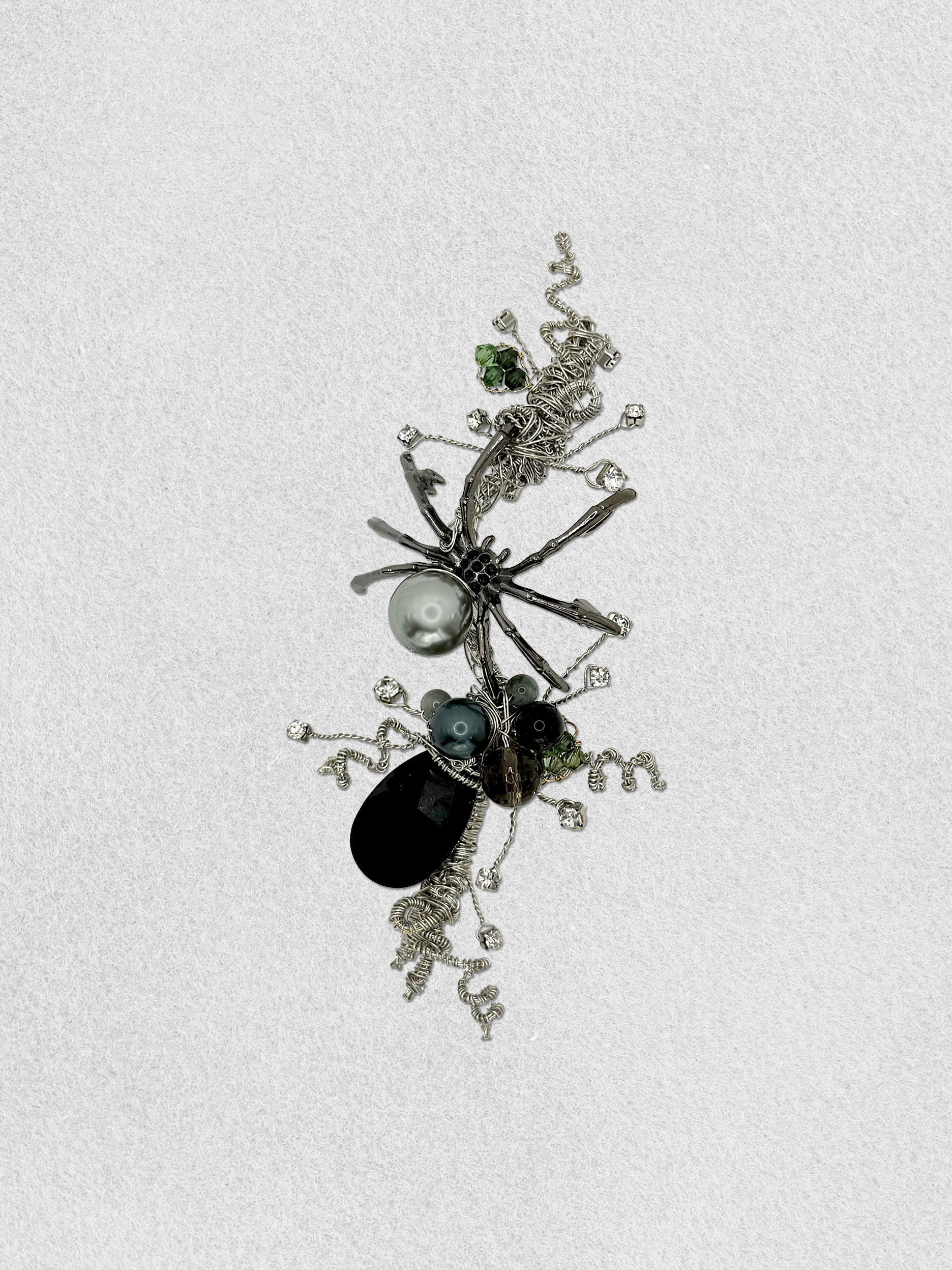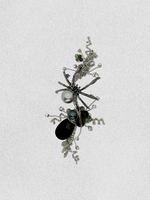 The Webs of Elegance lapel pin. In this scene, a jeweled spider resting by a cluster of stones. The lapel pin is filled with crystal leaves, floating rhinestones and anchored by a black crystal drop.