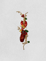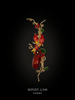 The Adoring Crimson Lovebirds lapel pin. In this scene, we see a pair of vintager and crimson lovebirds adoring one another perched atop a gold branch above a red rose waiting to bloom. It is accented by fern green crystal leaves, a crystal drop. All finished with 14k gold-filled wire.